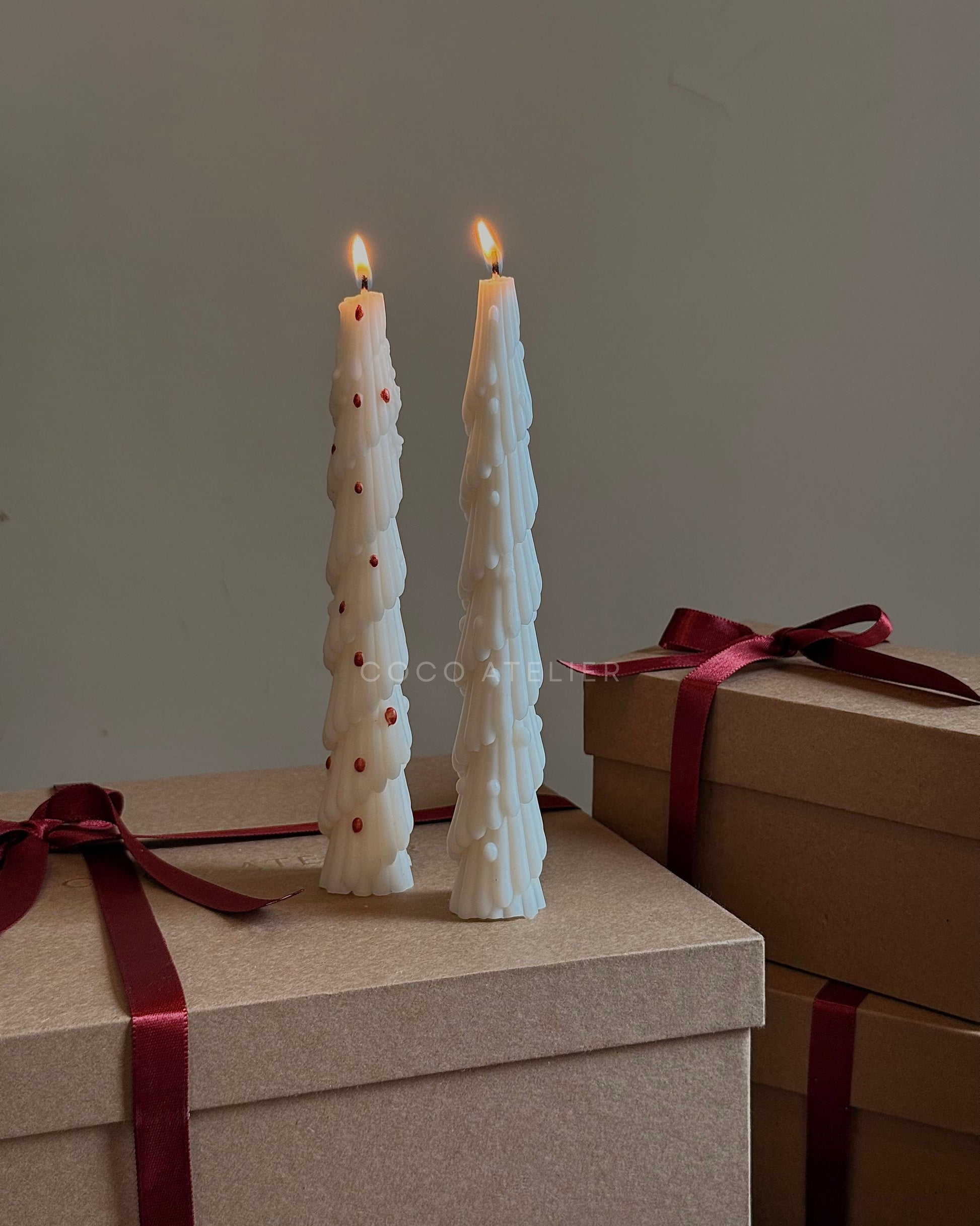 A Christmas tree candle that captures the quiet beauty of a winter forest & reminiscent of evergreens dusted with winter snow.